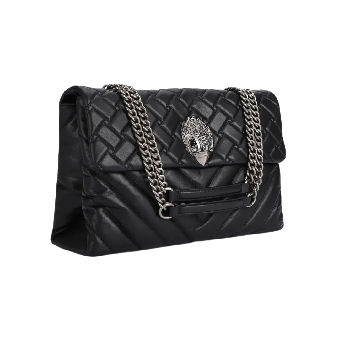 The Kurt Geiger London Kensington Large Bag is a standout accessory crafted from supple lambskin leather with a blend of weave and chevron quilting. This extra-spacious silhouette features the iconic antiqued silver eagle head adorned with opaque silver crystals and black crystal eyes. With dual interior compartments, a chain strap with leather padding, and secure magnetic flap closure, this bag is as functional as it is striking—perfect for bold everyday styling.
