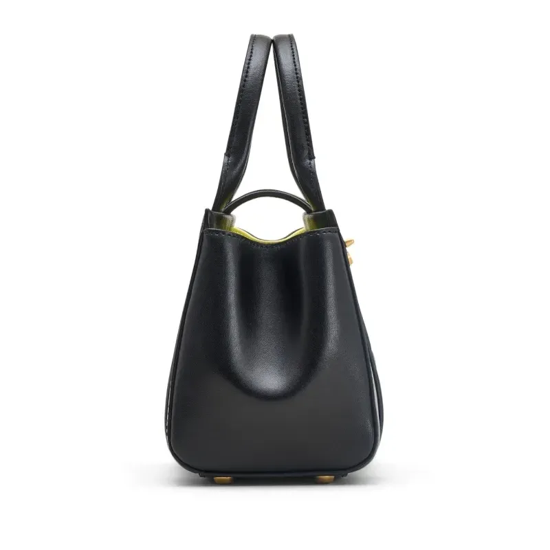 Compact crossbody tote in smooth black Nappa leather with secure twist‑lock closure and detachable chain strap.