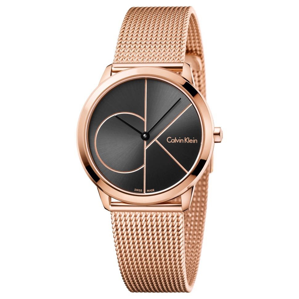 Women’s watch with black dial and rose gold stainless steel bracelet.