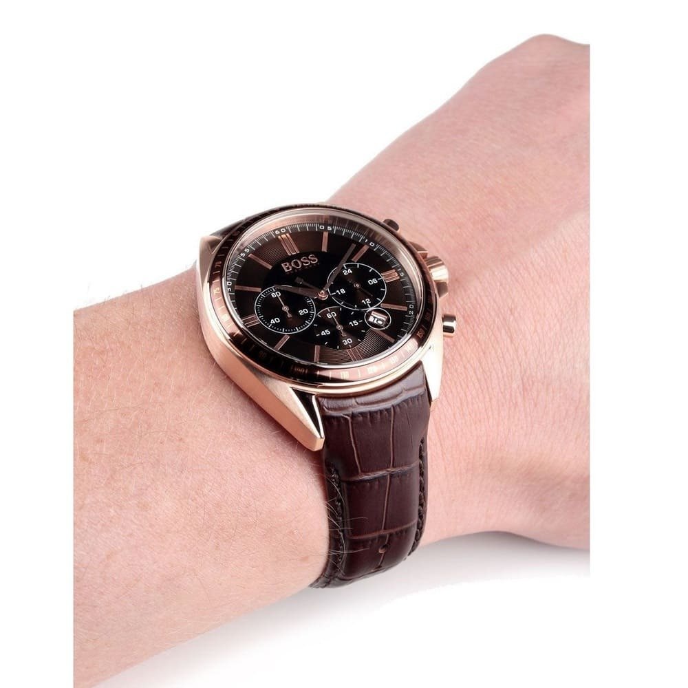 The Hugo Boss 1513093 is a men’s analog chronograph watch with a 43mm rose gold-tone stainless steel case and a brown dial. It includes rose gold-tone hands and index hour markers, with a date display between the 4 and 5 o’clock positions. The watch features three sub-dials displaying 60 seconds, 60 minutes, and 24 hours. Powered by a quartz movement, it is water-resistant up to 50 meters. The brown leather strap adds a sophisticated touch to its design.