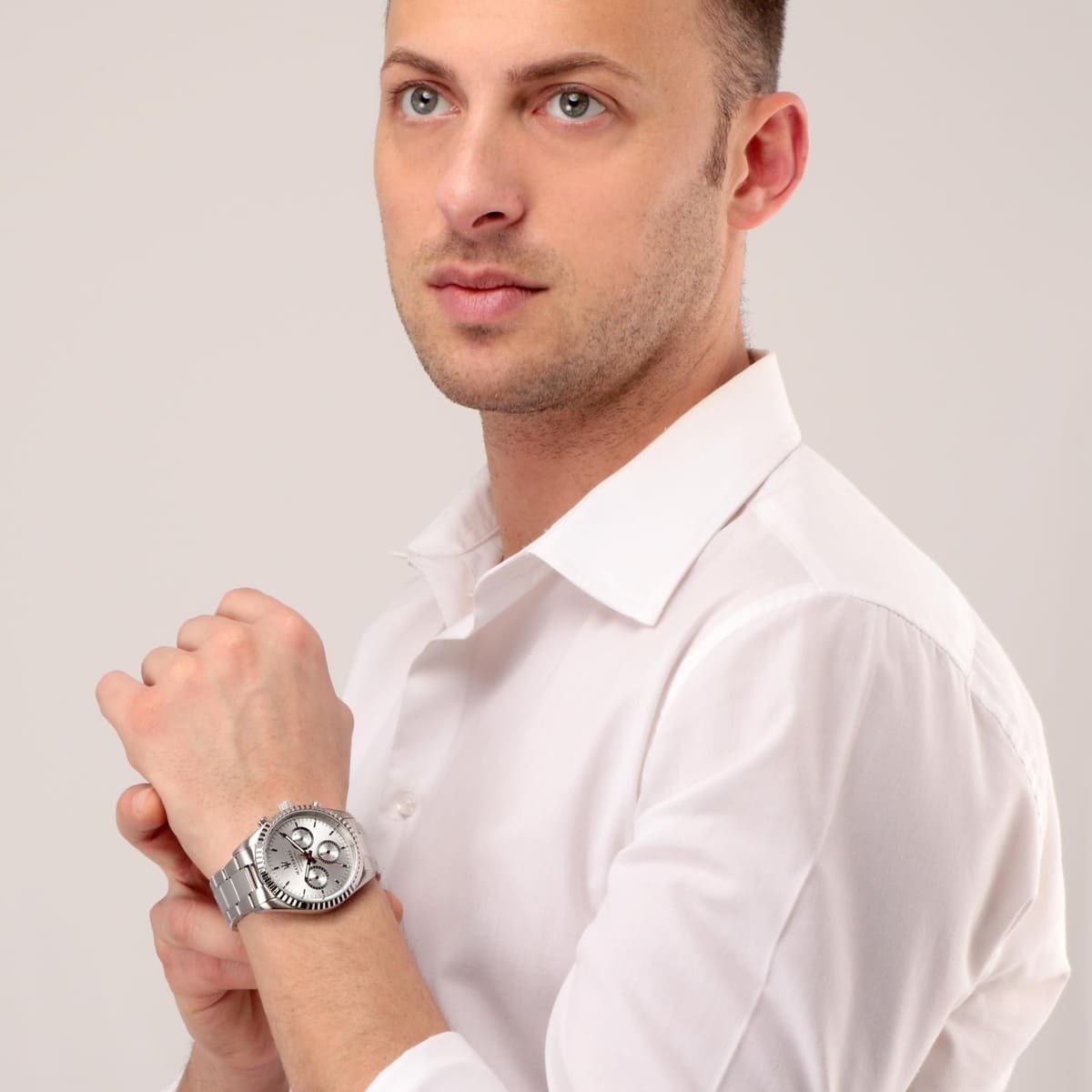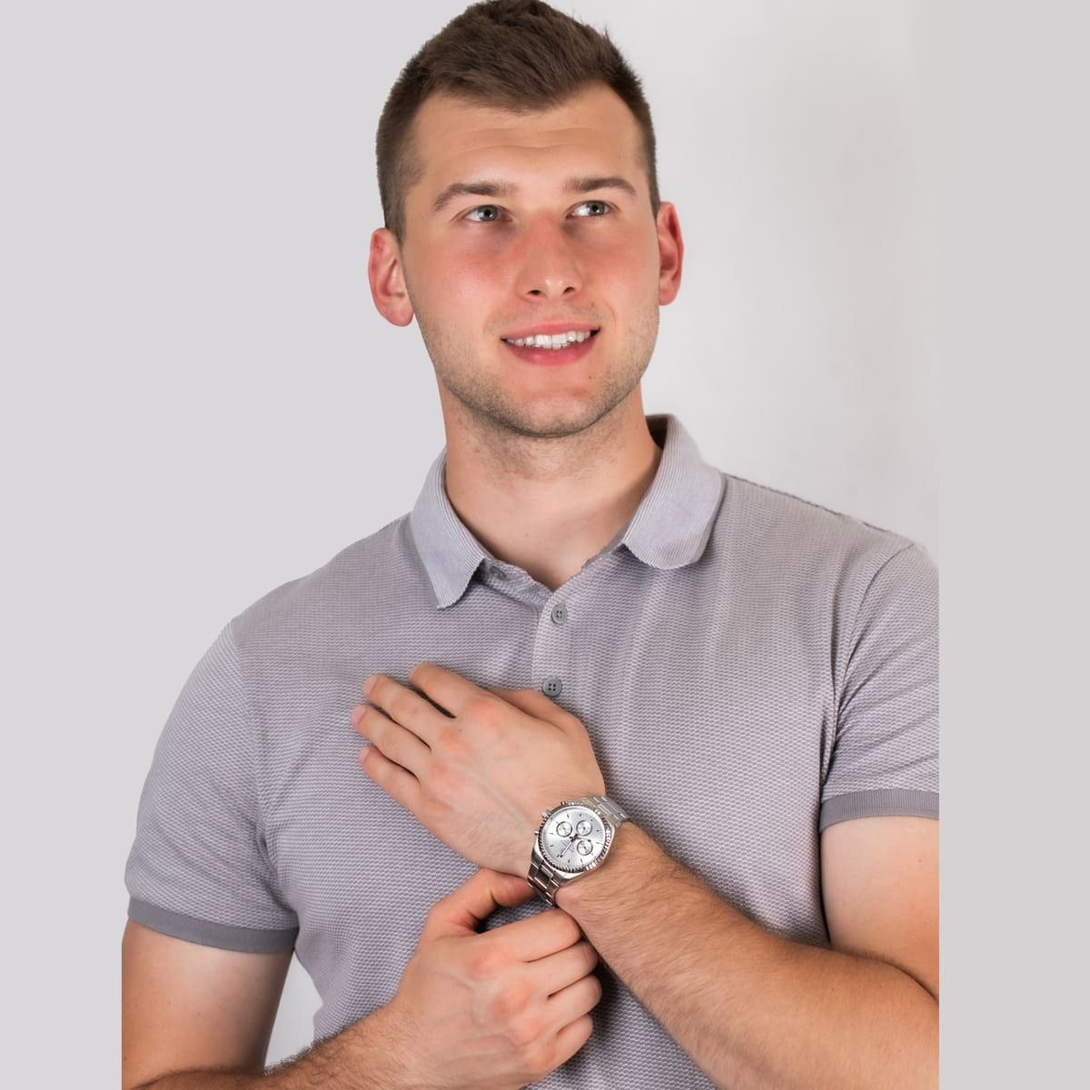 Men’s analog quartz watch with a silver dial, silver-tone stainless steel case, and matching bracelet.