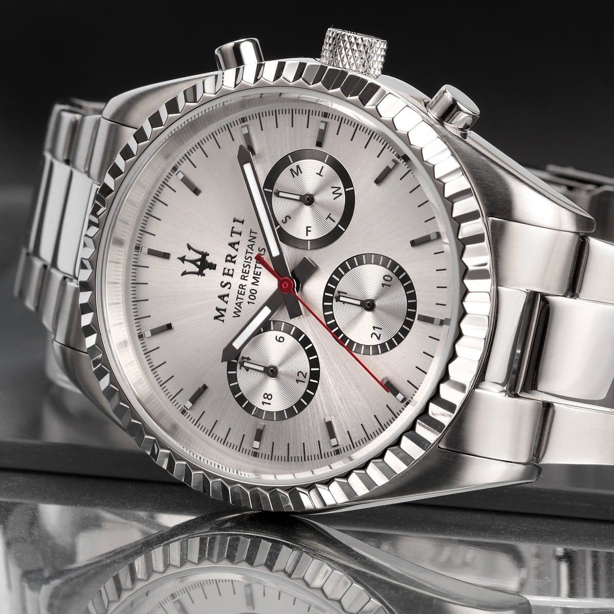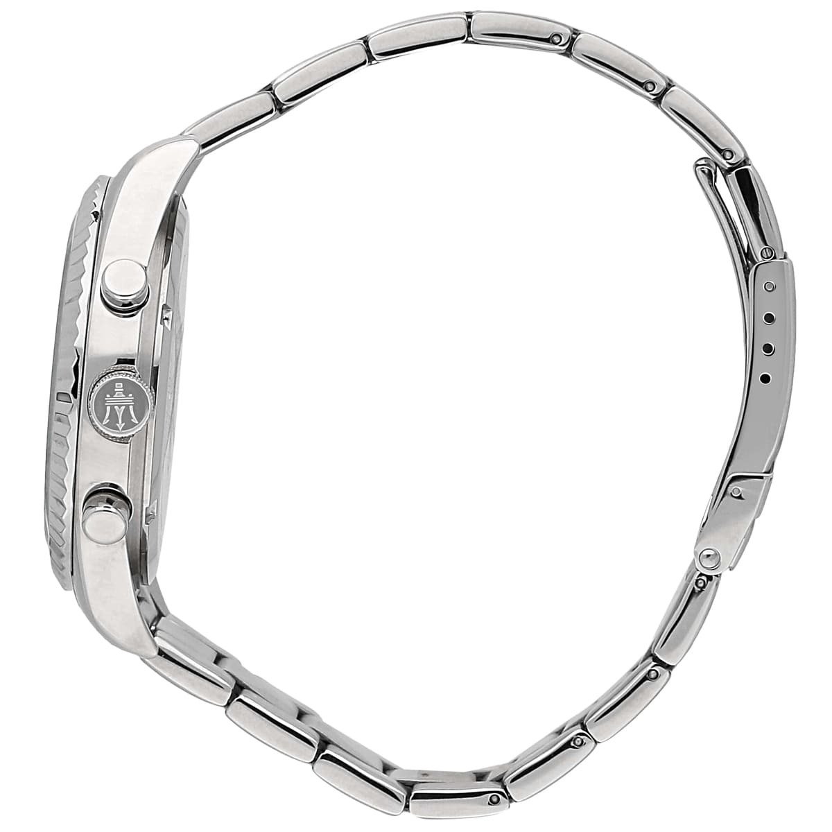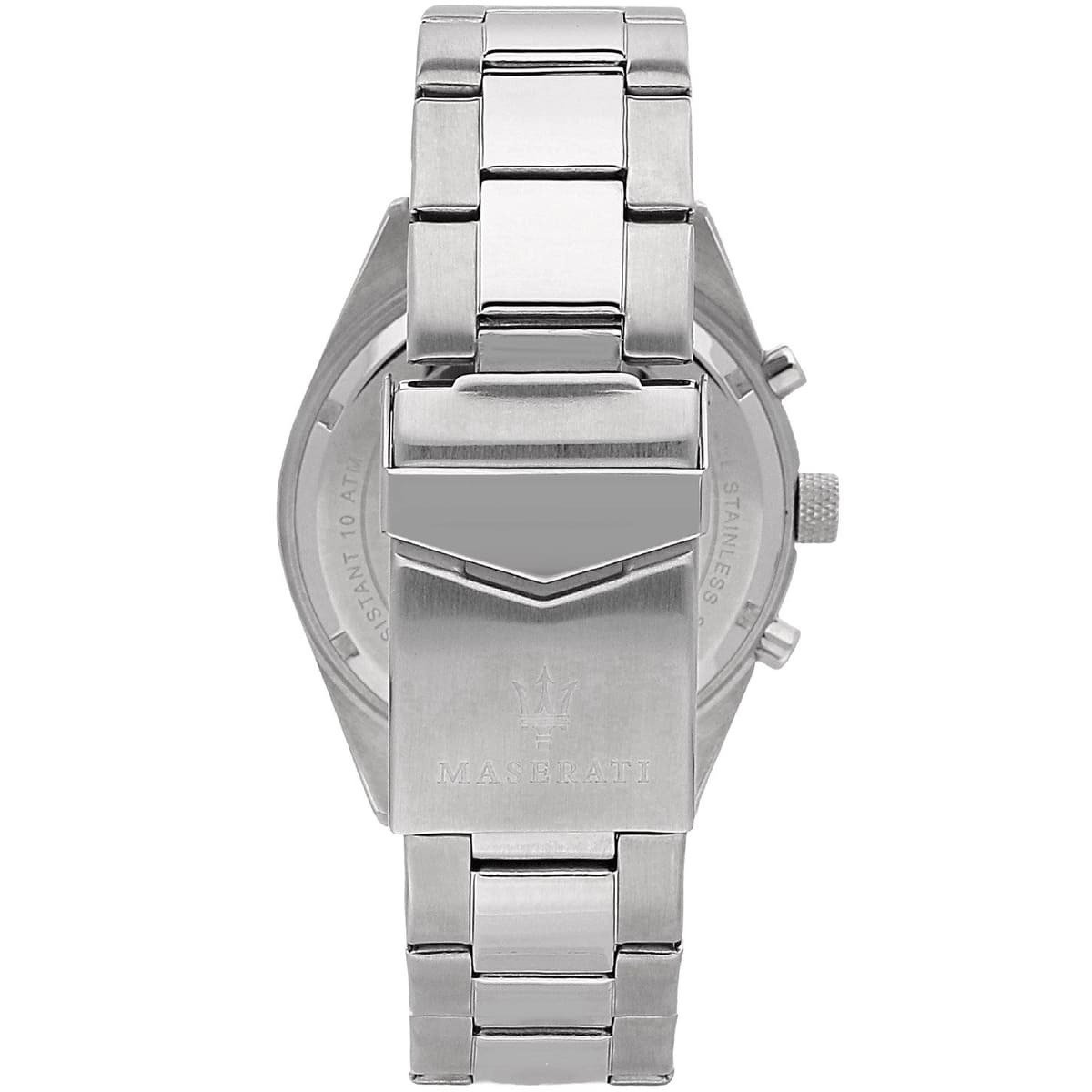 The Maserati Competizione R8853100018 features a 43mm silver-tone stainless steel case with a silver dial. It includes silver-tone hands and index hour markers, with a date display showing both the day of the week and the month. The watch is powered by a quartz movement and is water-resistant up to 100 meters. The silver-tone stainless steel bracelet adds a touch of elegance to its design.