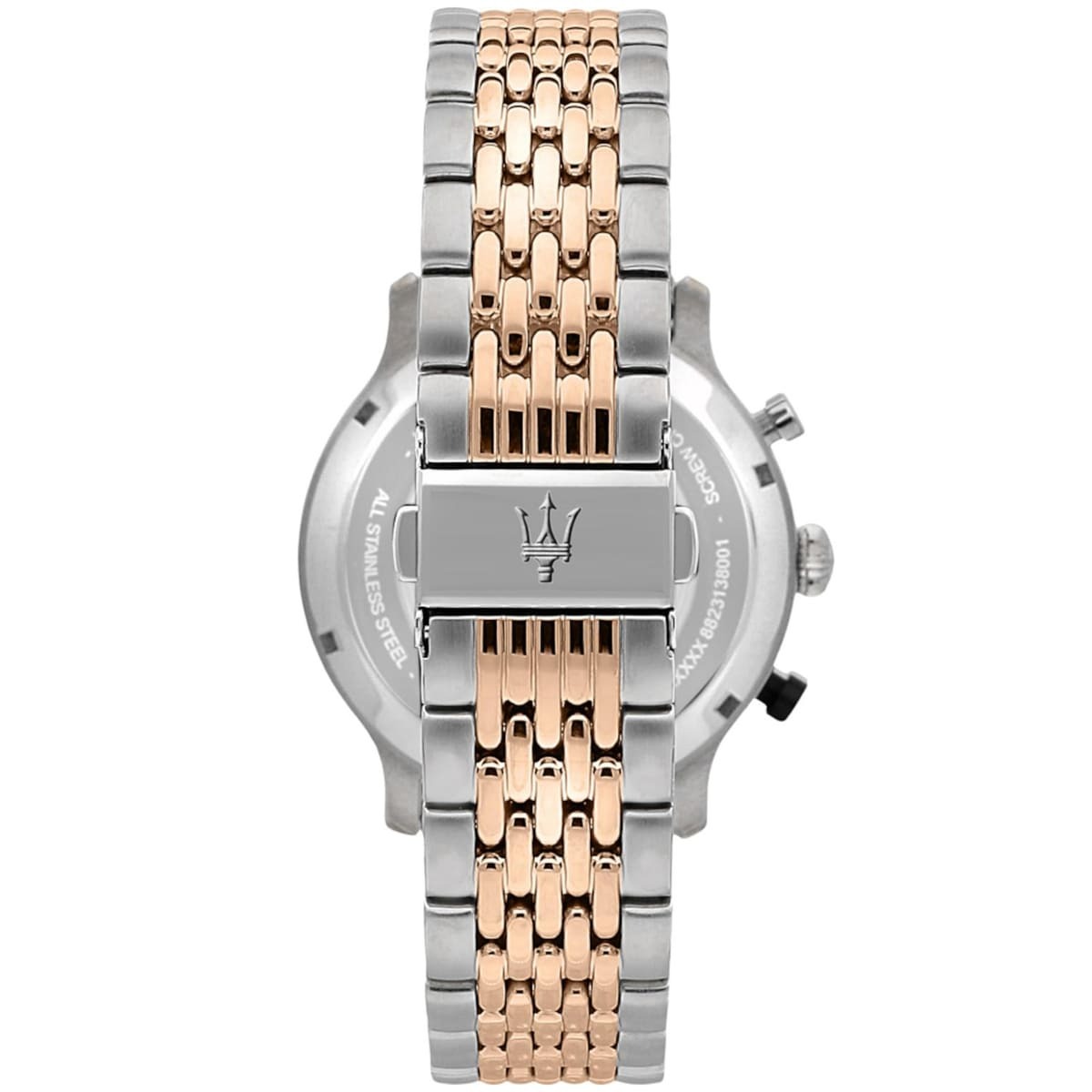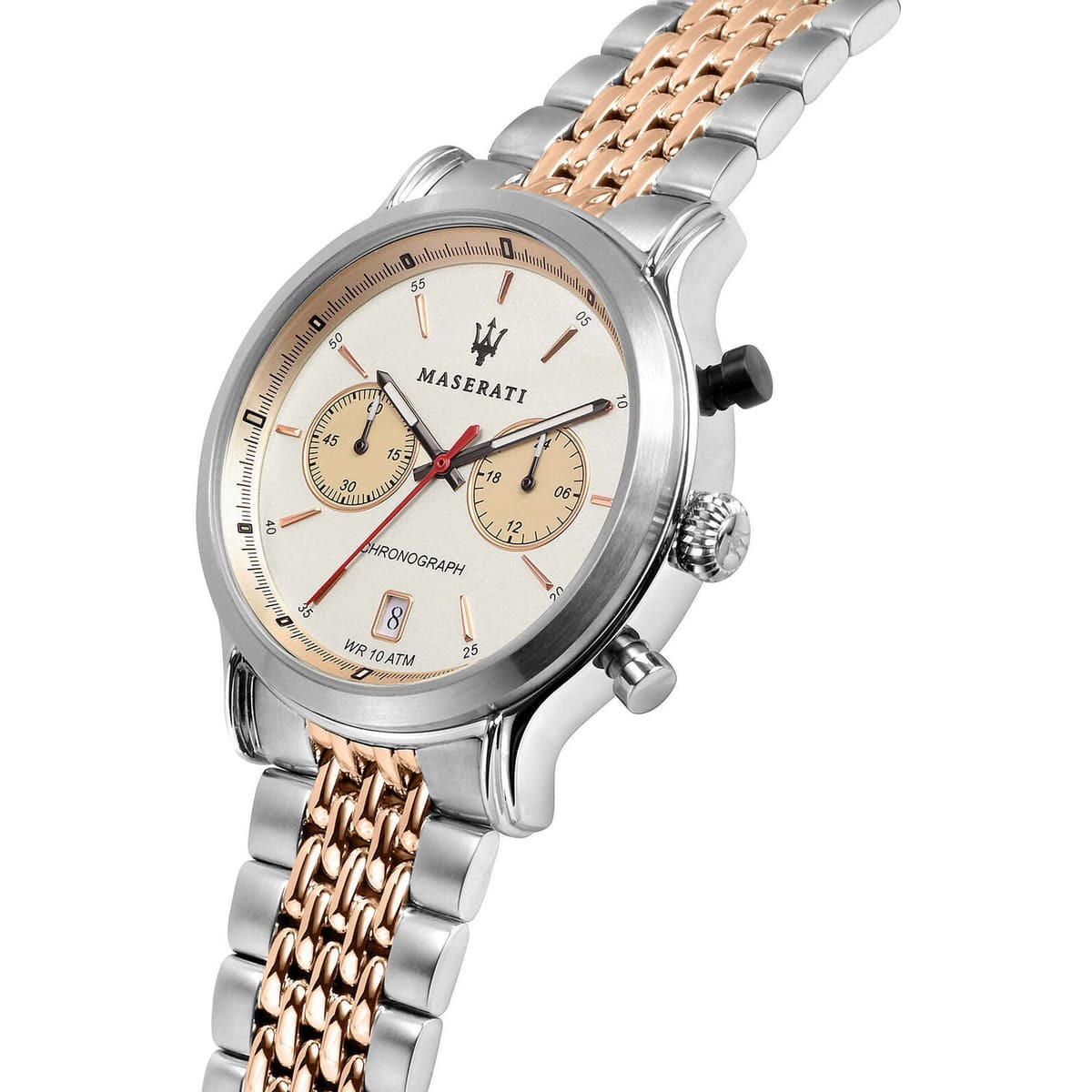 The Maserati Legend R8873638002 is a men’s analog chronograph watch with a 42mm stainless steel case and an ivory sunray dial. It includes rose gold-tone hands and index hour markers, with a date display between the 4 and 5 o’clock positions. The watch features three sub-dials displaying 60 seconds, 60 minutes, and 24 hours. Powered by a quartz movement (Caliber VK64), it is water-resistant up to 100 meters. The two-tone silver and rose gold stainless steel bracelet adds a sophisticated touch to its design.