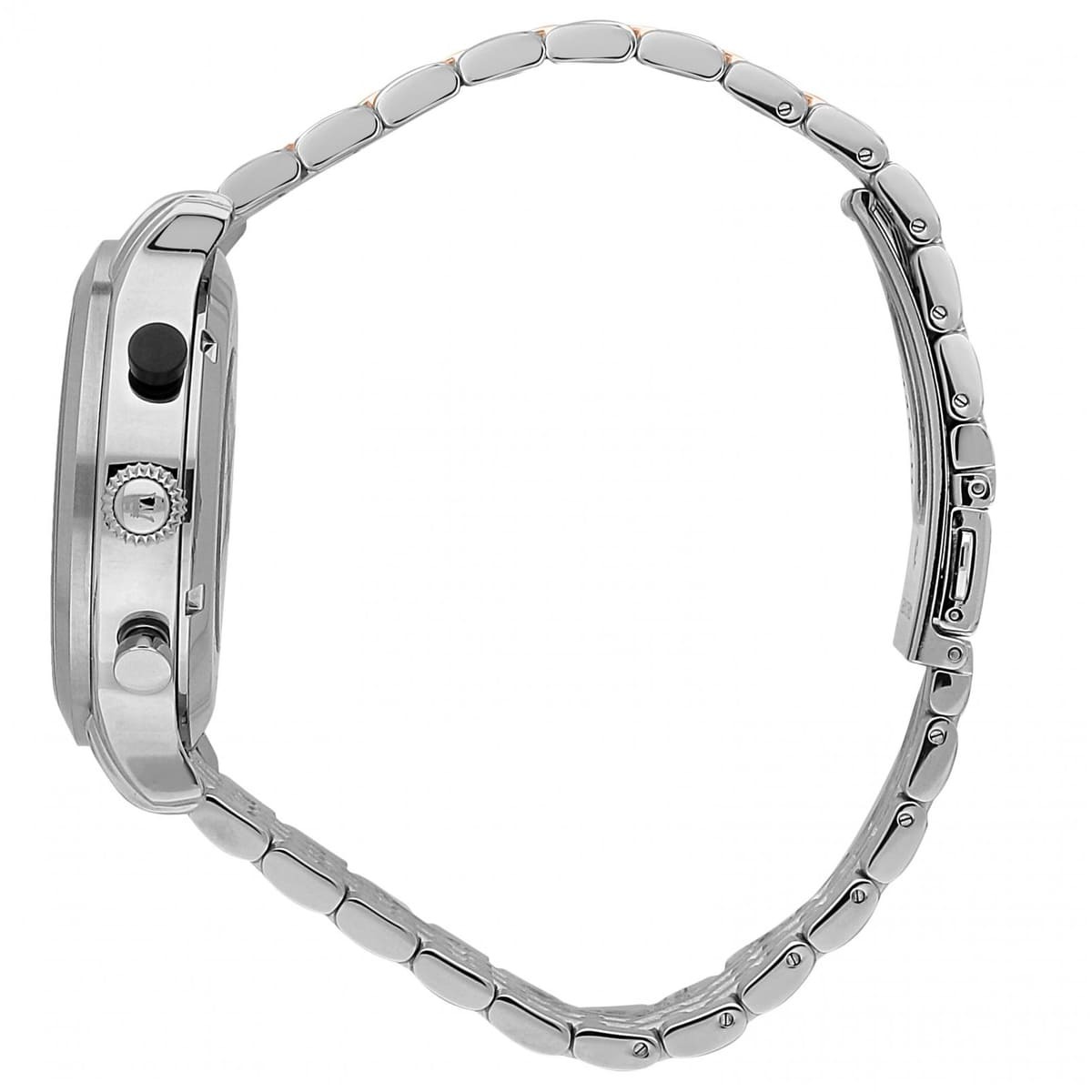 Men’s chronograph watch featuring an ivory sunray dial, silver-tone stainless steel case, and two-tone silver and rose gold stainless steel bracelet.