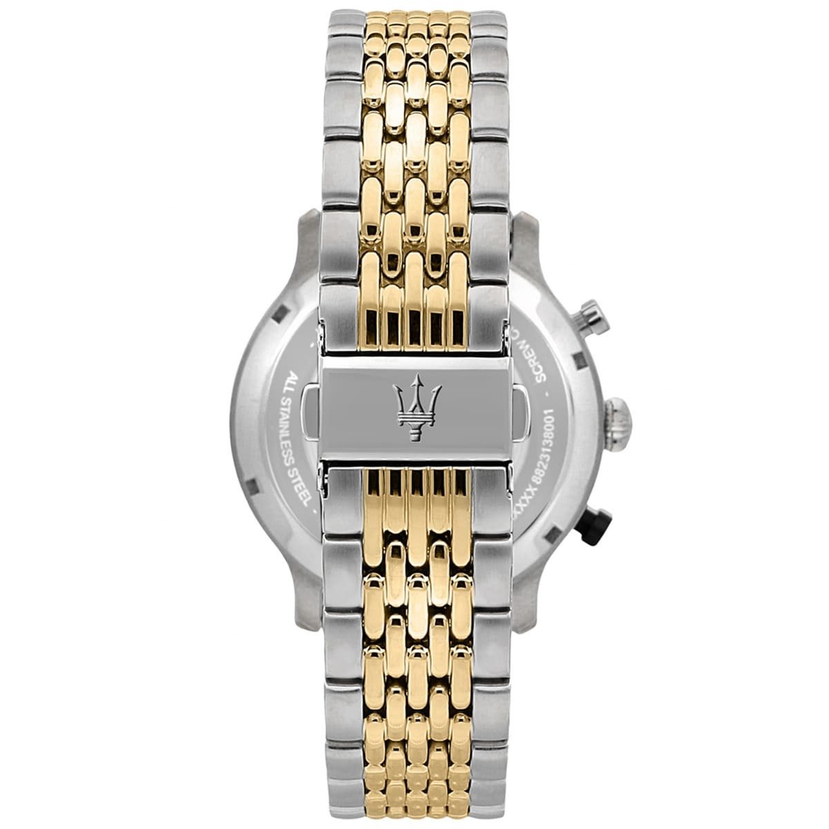 The Maserati Legend R8873638003 is a men’s quartz chronograph watch featuring a 42mm stainless steel case with a polished two-tone finish. It has a brown dial with silver and gold-tone markers and hands, protected by mineral crystal glass. The watch includes a date window between 4 and 5 o’clock, three subdials (60 sec, 60 min, 24h), and is powered by a quartz movement. The two-tone bracelet with push-button deployment clasp adds a sleek, elegant finish. Water resistance up to 100 meters.