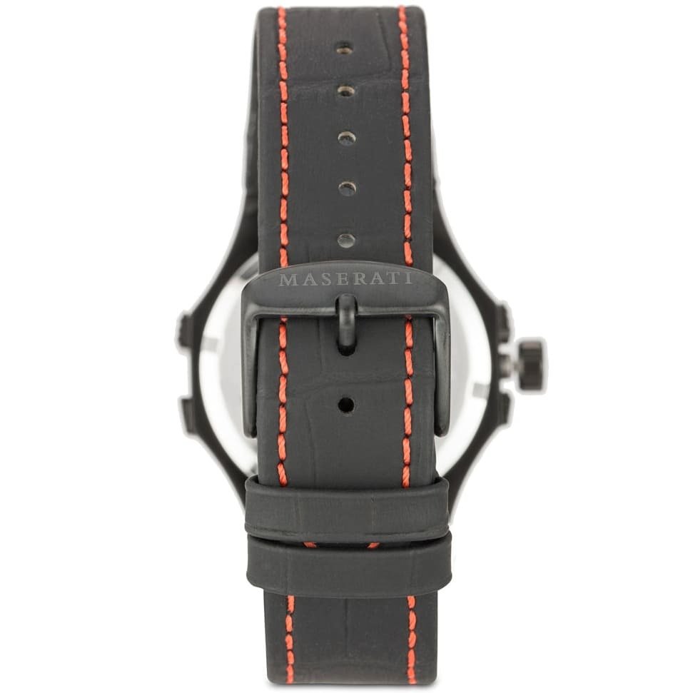The Maserati Potenza R8851108010 features a 42mm black stainless steel ion-plated case with a black dial. It includes silver-tone and red hands, index hour markers, and a date display at the 6 o’clock position. The watch is powered by a Hattori Calibre VJ42 quartz movement and is water-resistant up to 100 meters. The black leather strap with red stitching adds a sporty touch to its design.