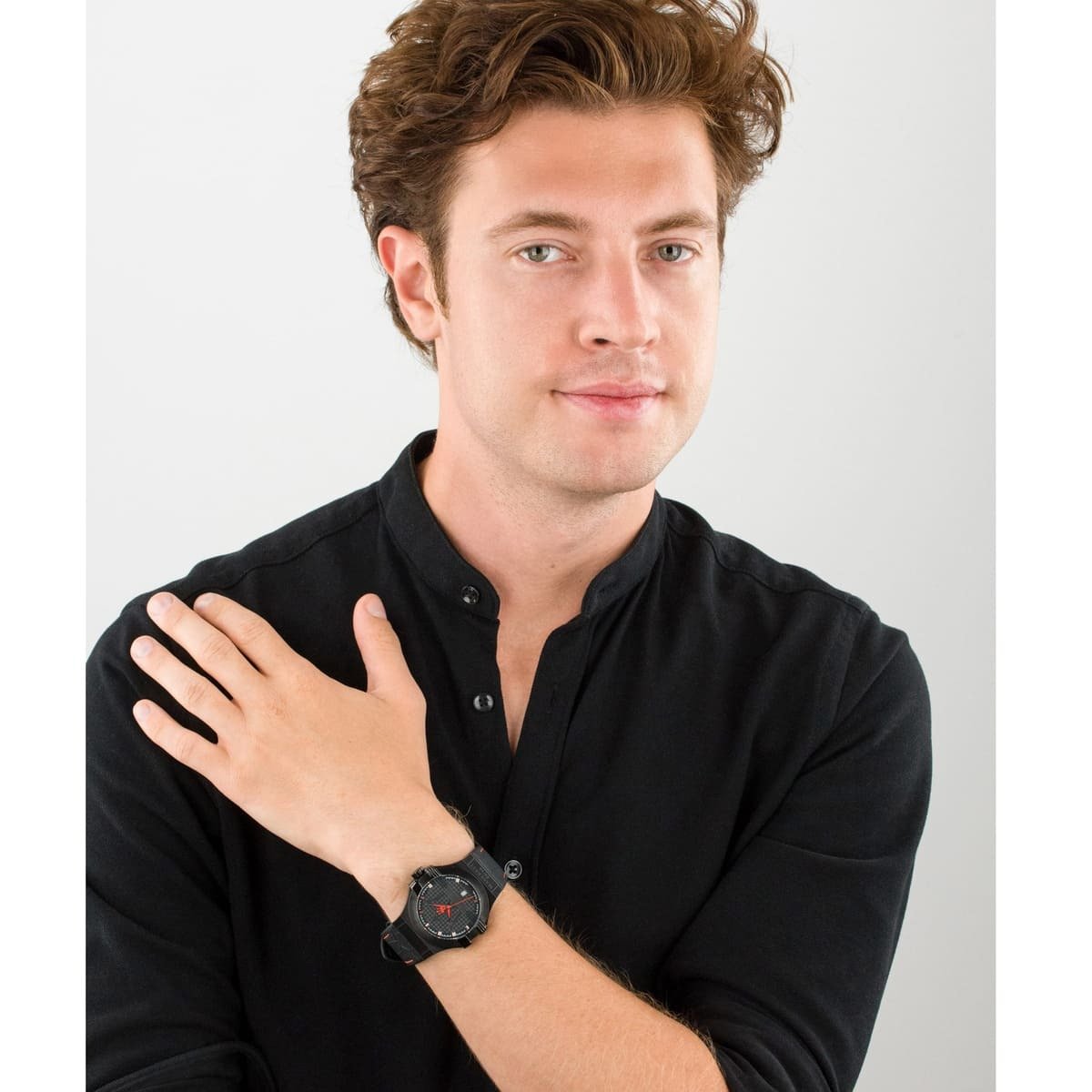 Men’s analog quartz watch with a black dial, black stainless steel ion-plated case, and black leather strap with red stitching.