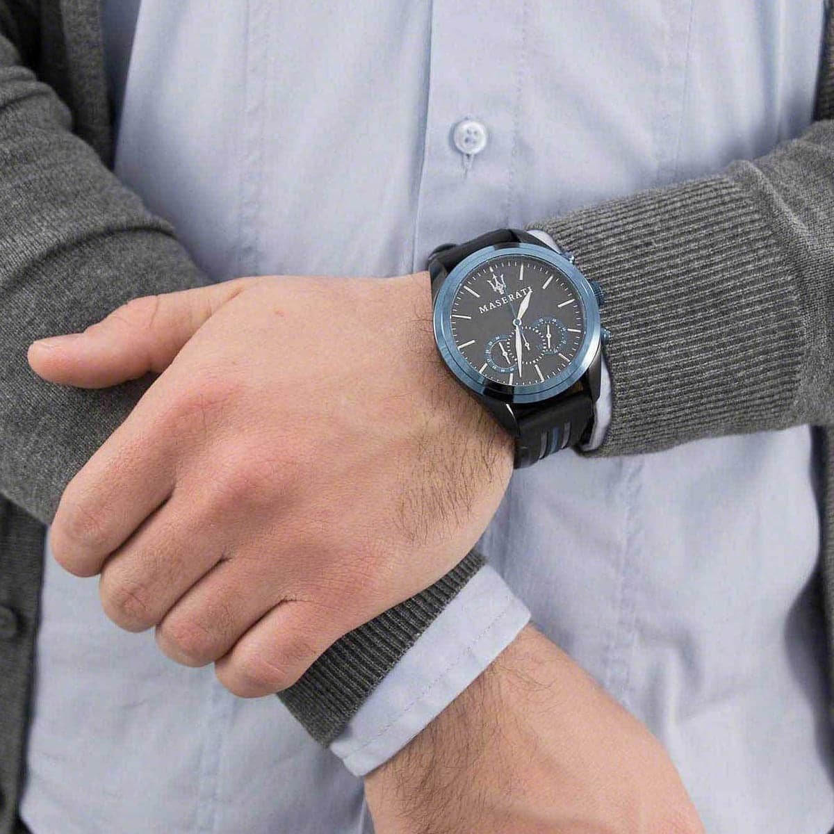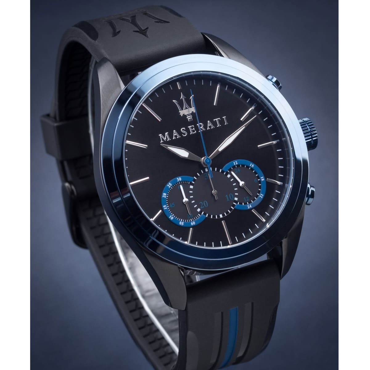 The Maserati Traguardo R8871612006 is a men’s analog chronograph watch with a 45mm black PVD stainless steel case and a black dial. It includes luminous silver-tone hands and index hour markers, with minute markers around the outer rim. The watch features three sub-dials displaying 60 seconds, 30 minutes, and 24 hours. Powered by a Miyota caliber JS50-00C quartz movement, it is water-resistant up to 100 meters. The black rubber strap with blue accents adds a sporty touch to its design.