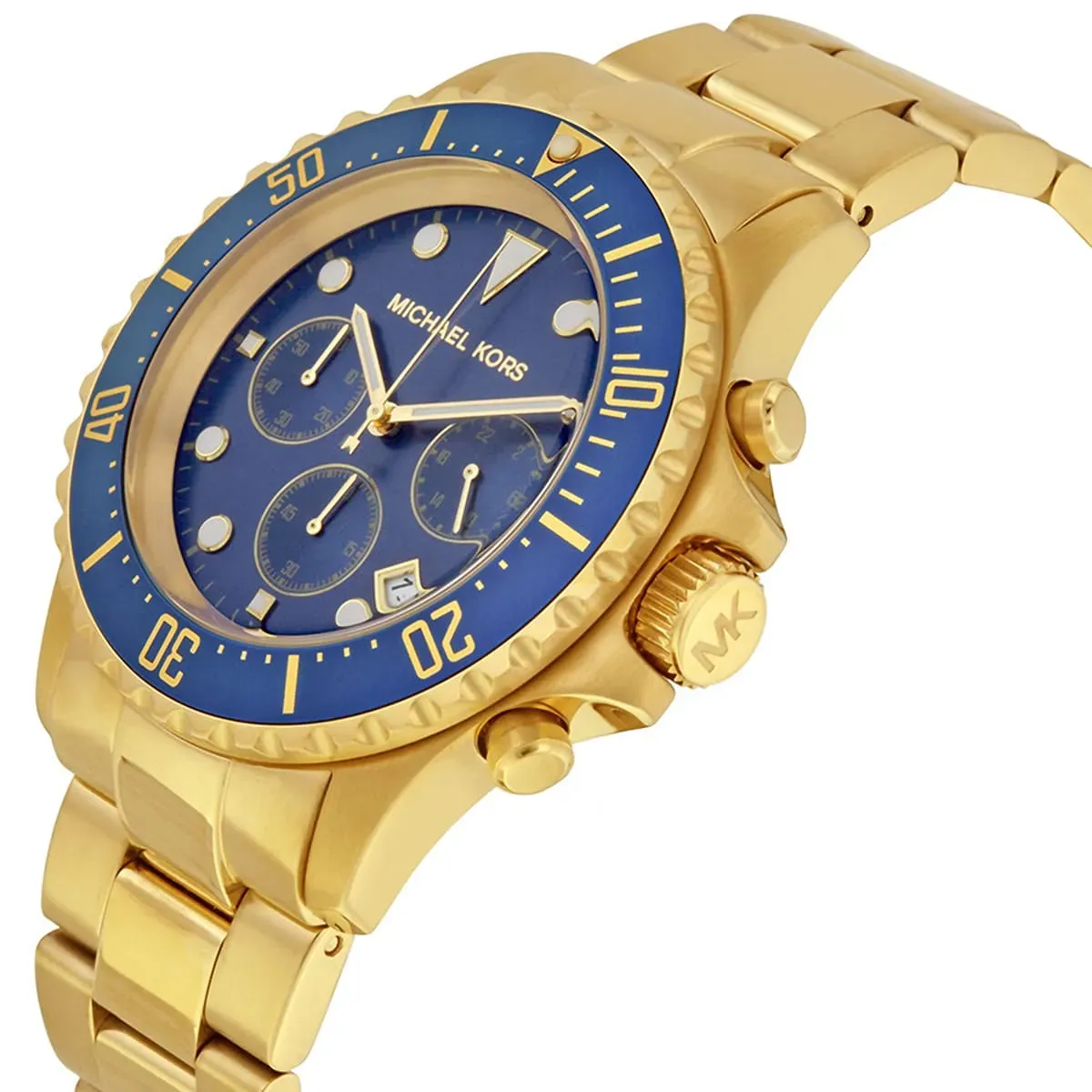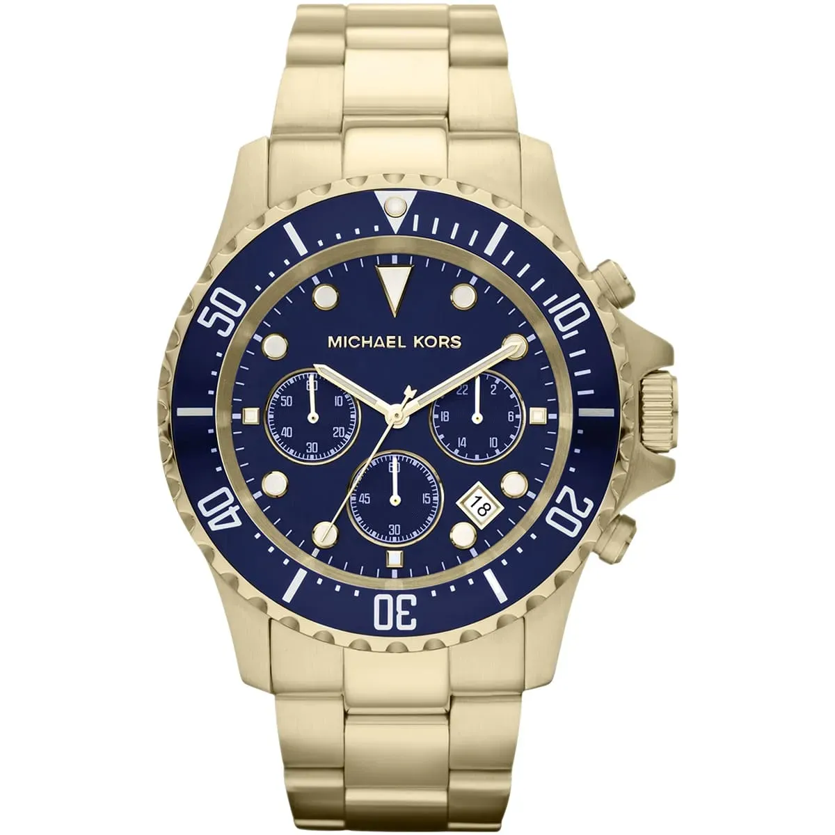 The Michael Kors MK8267 is a men’s analog chronograph watch with a 45mm gold-tone stainless steel case and a blue dial. It includes luminous hands and index hour markers, with a date display between the 4 and 5 o’clock positions. The watch features three sub-dials displaying 60 seconds, 30 minutes, and 24 hours. Powered by a quartz movement, it is water-resistant up to 100 meters. The gold-tone stainless steel bracelet adds a sophisticated touch to its design.