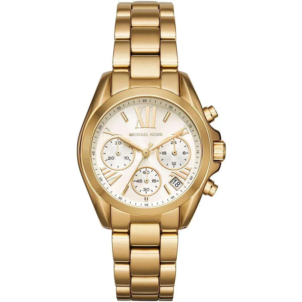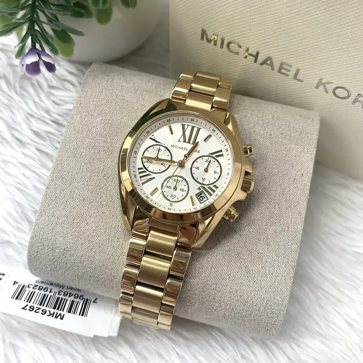 MK GoldWhite Chrono blends timeless elegance with functionality. Featuring a white chronograph dial and a polished gold-tone stainless steel bracelet, this Bradshaw model offers a sophisticated and versatile look for any occasion. Driven by quartz movement and water resistant.