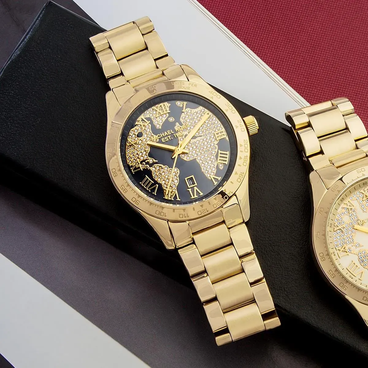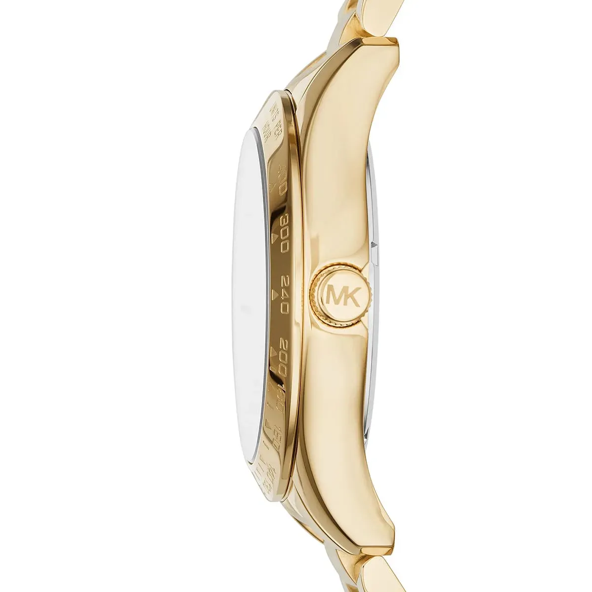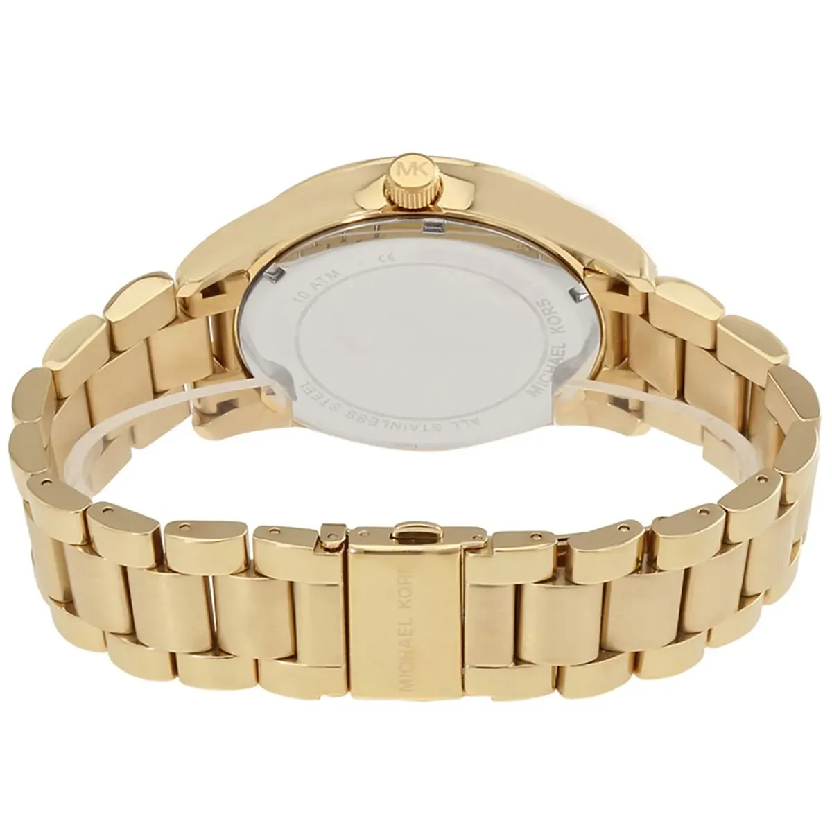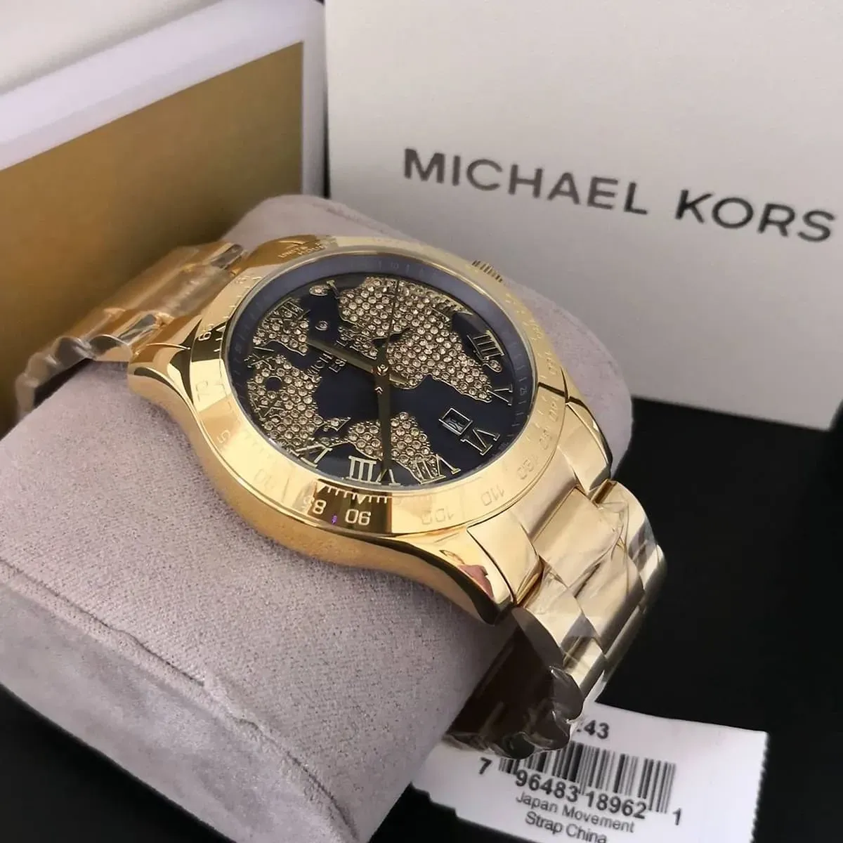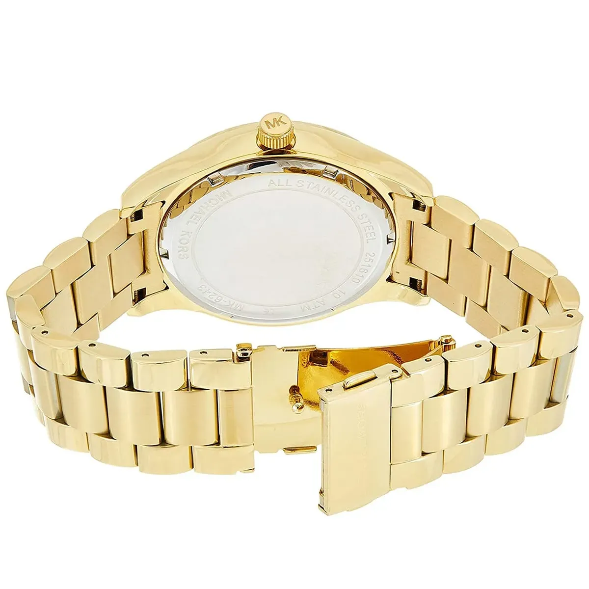 MK Layton WorldGold features a globe-inspired blue dial decorated with crystals, paired with a gold-tone stainless steel strap. A statement piece celebrating global style, perfect for modern women with a traveler’s soul.