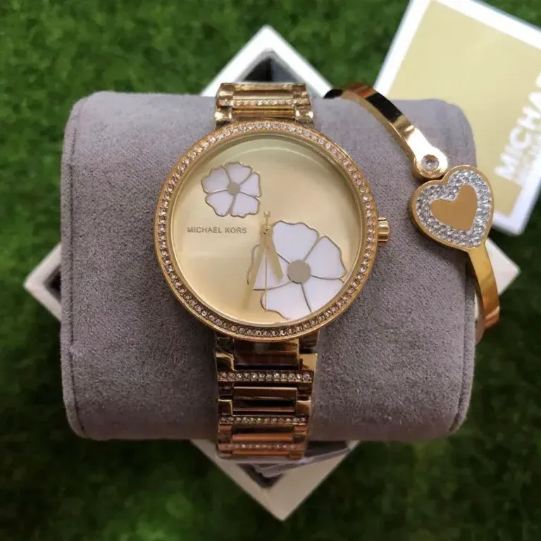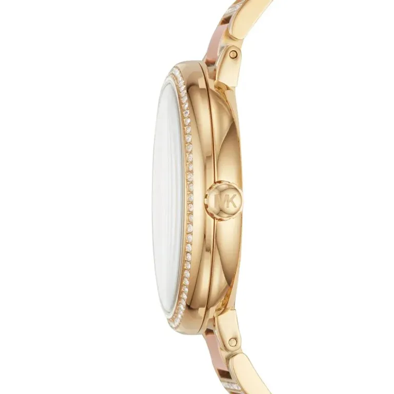 MK RoséBloom is a standout piece featuring a rose gold floral-patterned dial adorned with shimmering crystals. Paired with a two-tone stainless steel bracelet in gold and rose gold, this watch brings elegance and femininity together. A true original with quartz movement and water resistance.
