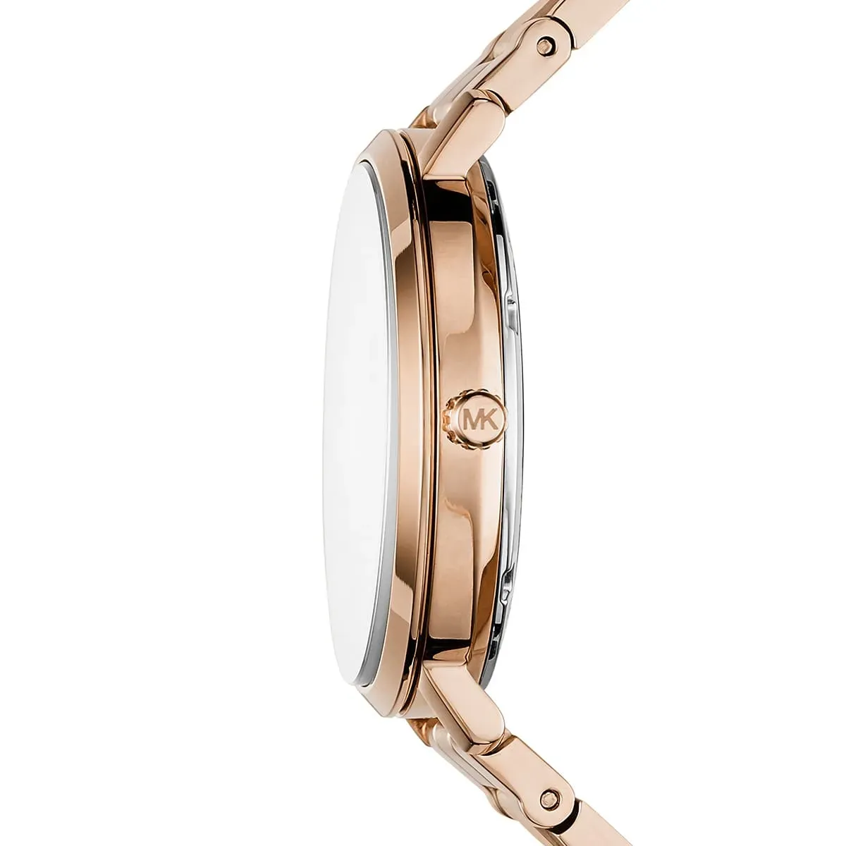 MK RoséCrystal shines with full rose gold-tone design, featuring a mother-of-pearl dial and a crystal-set bezel for added glamour. A luxurious yet wearable piece perfect for elegant day-to-night style. Fitted with quartz movement and water resistance.