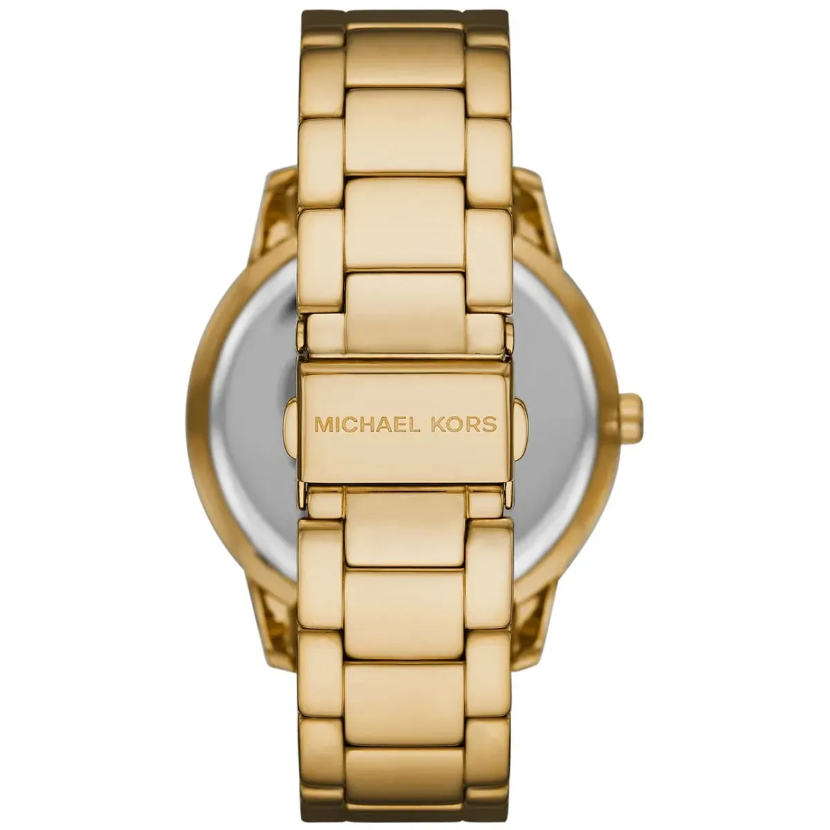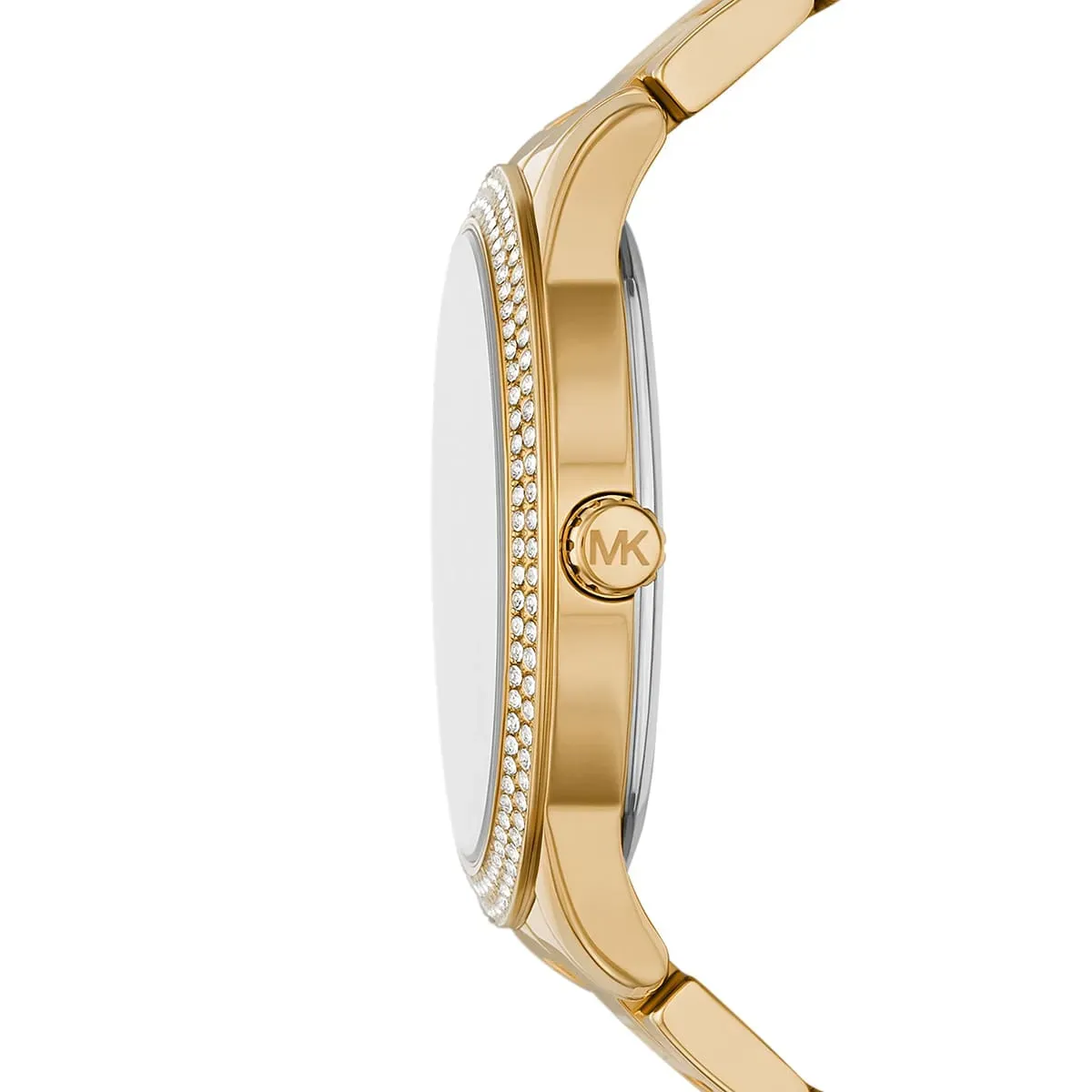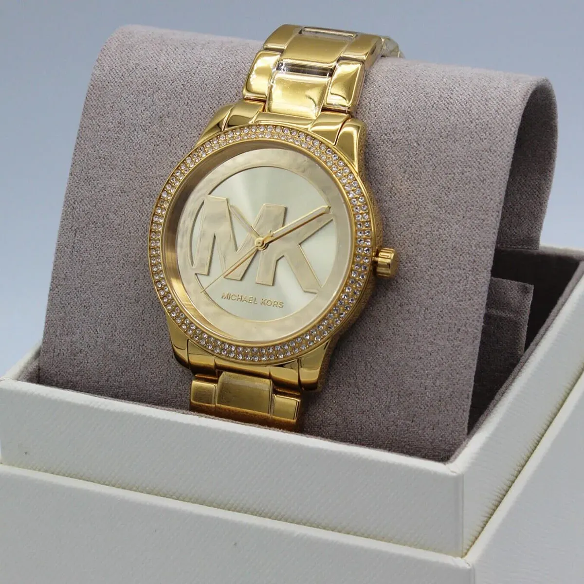 MK Tibby LogoGlow features a full gold-tone stainless steel bracelet with a dial showcasing the iconic MK logo, enhanced with sparkling crystal embellishments. A bold and fashionable choice for women who love standout accessories.