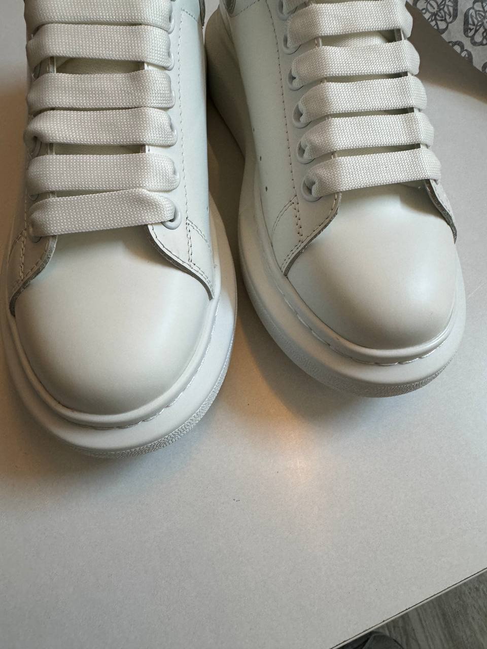 The Alexander McQueen Chunky Leather Sneakers bring modern glamour to a classic silhouette. Crafted from smooth white calf leather, these sneakers feature a wide rubber sole for bold style and all-day comfort. A crisscross side yoke adds sculptural detail, while the padded heel tab glitters with SilverMetallic for a statement finish. Complete with a circular toe and clean lines, this pair perfectly balances luxury and contemporary streetwear edge.