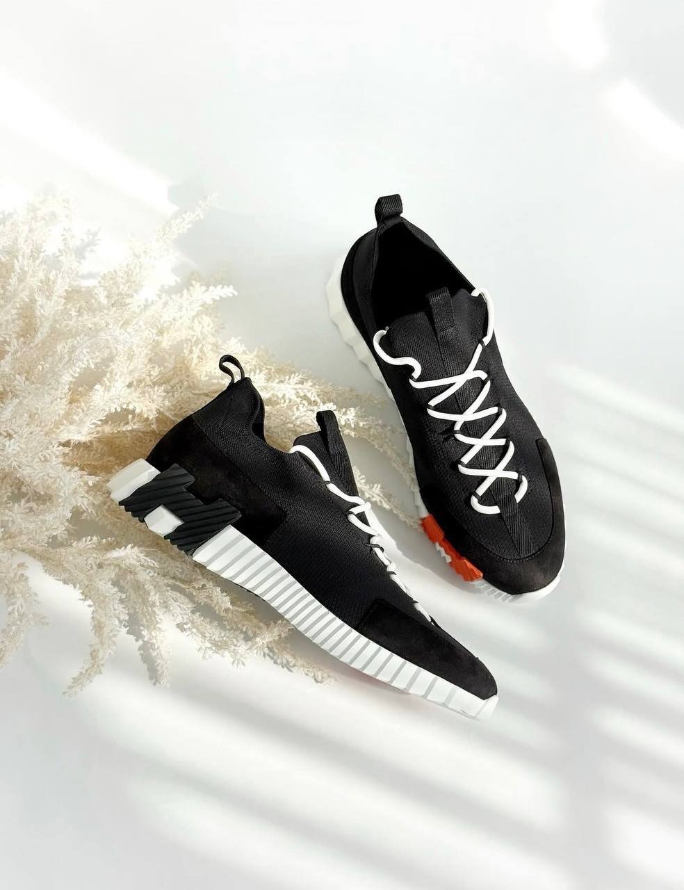 The Hermès Bouncing Sneaker Black fuses luxurious craftsmanship with sporty sophistication, featuring refined materials and subtle bursts of color.
