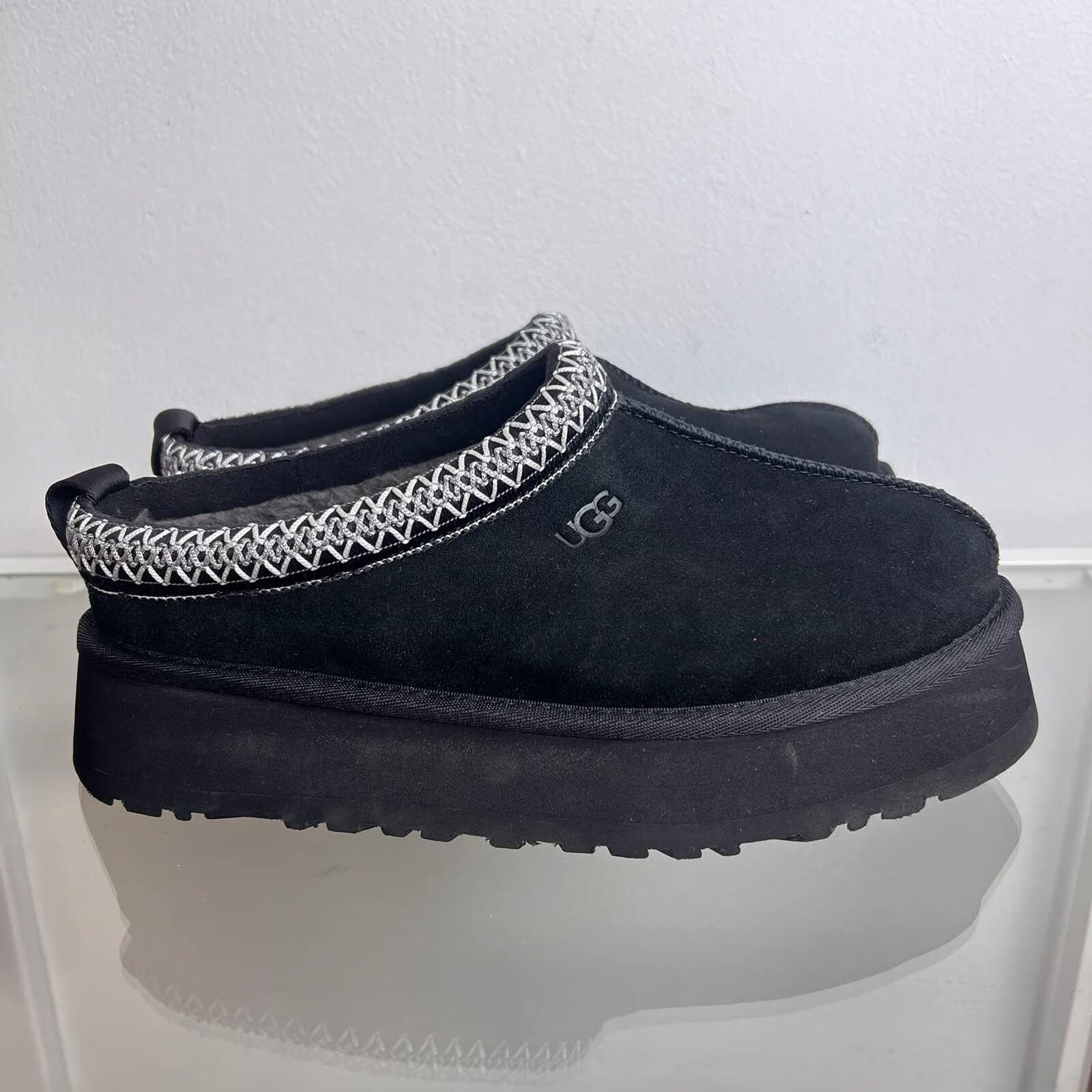 The UGG Tazz Slipper in Black reimagines the classic Tasman silhouette with a bold platform sole and elevated craftsmanship, combining comfort, warmth, and effortless modern style.