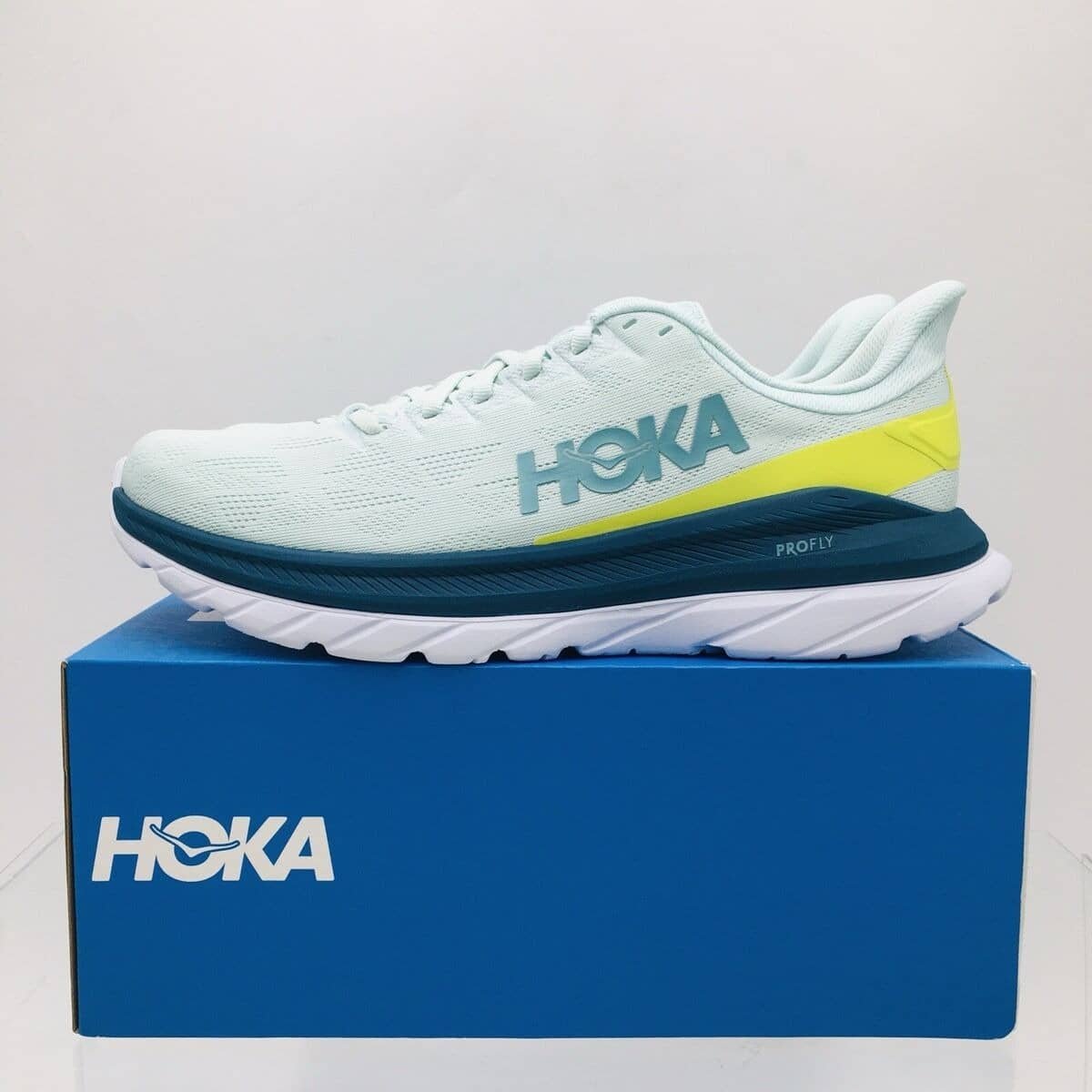 Step up your running experience with Hoka Running Shoes in a fresh Light Blue/Green colorway. Crafted for men seeking a balance of style, comfort, and performance, these sneakers feature a ProFly™ midsole that provides smooth, cushioned propulsion, while Meta-Rocker technology encourages a natural stride and reduces fatigue. The lightweight, breathable mesh upper ensures maximum airflow, keeping your feet dry and comfortable throughout your run. A durable rubber outsole delivers reliable grip and stability on various surfaces, and the padded collar and tongue enhance comfort while providing a secure fit. Perfect for long-distance runs, training sessions, or everyday wear, these Hoka shoes are engineered for those who demand support, responsiveness, and durability in every step.