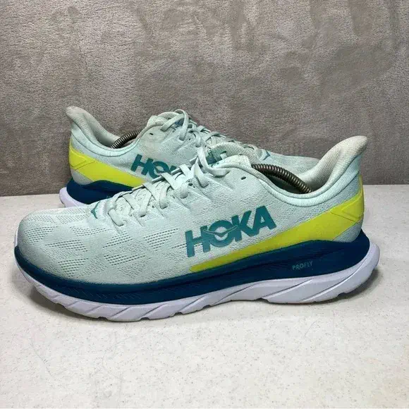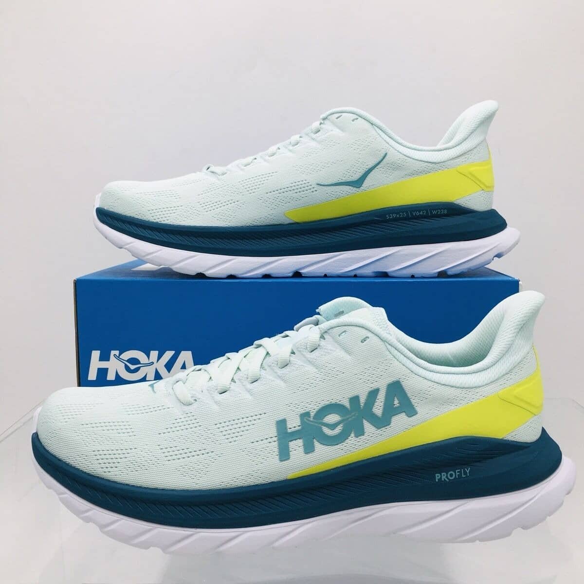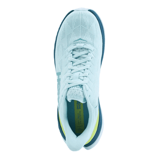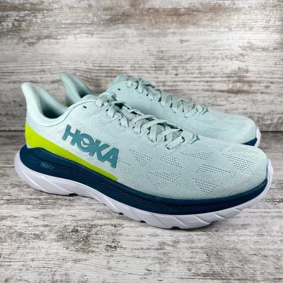 Hoka Running Shoes in Light Blue/Green combine lightweight cushioning, Meta-Rocker technology, and breathable design for superior comfort and performance on every run.